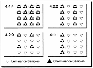 Рис. 1 Форматы представления видеоданных Приведенные в таблице пять профилей и четыре уровня образуют двадцать возможных комбинаций видеосигнала, из которых, вероятнее всего, только одиннадцать будут полезными или необходимыми. Для этих комбинаций (согласованные точки) в таблице указаны максимальные значения скорости передачи видеоданных. Комбинации, которые сегодня не вызывают интереса, в стандарте MPEG-2, пока, не нормированы и в таблице отмечены крестами. Для всех стандартизованных точек указаны максимальные потоки видеоданных, которые позволяют получить ТВ изображение, свободное от каких-либо дефектов. В иных случаях они могут проявиться в процессах кодирования/декодирования видеосигнала. Используемые в конкретных кодеках потоки видеоданных могут быть меньше (в несколько раз) указанных значений. Выбор уровня компрессии и, в конечном итоге, уровня потока зависит от допустимой степени искажений ТВ изображения. Таким образом, стандарт MPEG-2 позволяет гибко менять скорость передачи видеоданных в очень широких пределах. Надо заметить, что системы кодирования стандарта MPEG-2 могут работать как с чересстрочной, так и с прогрессивной развертками, при частоте полей 50 или 60 Гц и т. д. Для каждой стандартизованной точки таблице оговорено число отсчетов сигнала яркости на активной части строки. Рассмотренные комбинации параметров информационного кодирования пригодны для работы с различными цифровыми трактами и накопителями (записывающими устройствами). Стандарт MPEG-2 принципиально нацелен в будущее, все богатство упомянутых выше комбинаций станет работать, хотя и скоро, но не сейчас. Так, промышленность готова и будет выпускать в этом году ТВ приемники только одной системы кодирования: "Основной уровень - Основной профиль" с чересстрочным разложением изображения на 625 строк. Эта система принята для первого поколения цифровых телевизоров для непосредственного ТВ приема со спутников, работающих в диапазоне 11/12 ГГц, и кабельной сети распределения. Сказанное не означает, что массовый выпуск бытовых телевизоров для иных профилей и уровней, пока и до лучших времен, закрыт. Любая вещательная организация вправе использовать систему нового уровня кодирования. Просто следует публично заявить о намерениях и начать "переговорный процесс" с возможными изготовителями соответствующих телевизоров. Следует добавить, что при реализации системы по конкретному уровню/профилю необходимо пронормировать и поток видеоданных, который не должен превышать максимальные значения скоростей, указанные в стандартизованных точках (см. табл.). Если в системе планируется использовать несколько скоростей передачи видеоданных, следует указать максимальную из них. Компрессия видеоданных Телевизионный сигнал, как известно, избыточен. Различают статистическую избыточность, избыточность по восприятию, структурную и спектральную избыточность. По теории вероятностей избыточность является следствием определенных корреляционных связей. Корреляция означает, что некоторый элемент изображения более или менее существенно зависит от соседей в пространстве и во времени. Под статистической избыточностью понимают корреляционные связи между соседними (по вертикали и горизонтали) отсчетами ТВ сигнала. Сразу же надо подчеркнуть, что снижение избыточности в э