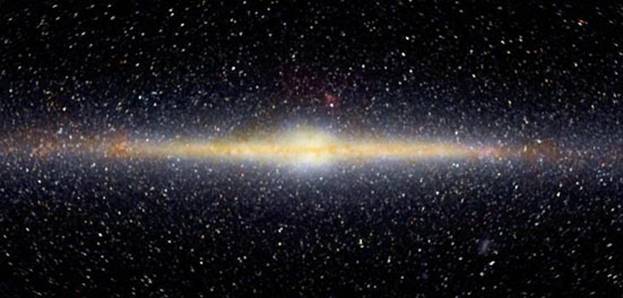 Только 70 лет назад более мощные телескопы сделали открытие , что Млечный Путь это одна галактика среди множества галактик. Современные космические телескопы дают еще более глубокое понимание. Сегодняшняя картинка была получена спутником для исследования космического фона . На ней изображена плоскость нашей Галактики в инфракрасном свете . Виден тонкий диск нашей спиральной галактики . На картинке звезды показаны белым цветом, межзвездная пыль - красным.