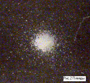 Примером звездных скоплений, хорошо видимых невооруженным глазом, являются скопления Плеяды и Гиады (оба в созвездии Тельца). В Плеядах нормальный глаз видит 5—7 слабых звездочек, располагающихся в виде маленького ковшика (по этому скоплению удобно проверять остроту зрения). В телескоп в Плеядах заметны сотни звезд (рис. 2). Гиады — скопление не столь компактное, как Плеяды, но оно содержит более яркие звезды. Рядом с Гиадами — красноватый Альдебаран — ярчайшая звезда в созвездии Тельца.