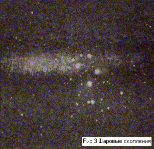 Шаровые скопления по размеру, как правило, больше рассеянных и содержат сотни тысяч звезд. Все они очень далеки от нас. Лишь одно-два можно заметить невооруженным глазом или в бинокль, но даже они из-за громадного расстояния видны как крошечные светящиеся пятнышки. На фотографиях шаровые скопления обычно выглядят как целый рой огромного числа звезд (рис. 3). Кажется, что в центре скопления звезды сливаются в сплошную светлую массу. Но на самом деле даже там между звездами достаточно много свободного пространства, чтобы они двигались, не сталкиваясь друг с другом. В отличие от рассеянных скоплений, в шаровых мы не наблюдаем молодых звезд. Это очень старые звездные системы. Их возраст трудно точно оценить. Основываясь на теории звездной эволюции, ученые получают оценки возраста наиболее старых скоплений в 13—18 млрд. лет.