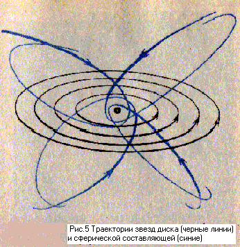 Звезды и скопления звезд сферической составляющей движутся по-иному, не так, как звезды диска. Их орбиты сильно вытянуты и наклонены к плоскости диска под все возможными углами (рис. 5) Такие звезды имеют относительно Солнца очень большие скорости (до 200—300 км/с). Но относительно центра Галактики средние скорости звезд как сферической составляющей, так и диска приблизительно одинаковы.
