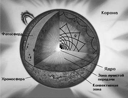 Сразу вокруг ядра начинается зона лучистой передачи энергии, где она распространяется через поглощение и излучение веществом порций света – квантов.