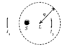 Рис.3. Гравитационная линза. Общий случай. S — проекция источника на фронтальную плоскость, L — проекция линзы, I1, I2 — изображения источника |