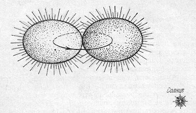 Две звезды, составляющие эту систему, так близки друг к другу, что под действием взаимного тяготения они изменили обычную для звезд шарообразную форму и превратились в вытянутые дынеобразные эллипсоиды (рис. 32). Кружась вокруг общего центра масс, эти два дынеобразных светила постоянно направлены друг к другу своими наиболее “острыми” сторонами. Всего около восьми часов нужно для того, чтобы обе звезды снова вернулись в исходное положение.