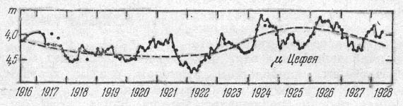 Подмечено, что блеск μ Цефея не всегда постоянен, но меняется довольно неправильным образом, причем иногда амплитуда колебаний достигает 0,6m. Советскому исследователю переменных звезд В. П. Цесевичу с большим трудом удалось установить, что в этих, с первого взгляда совершенно беспорядочных колебаниях блеска есть некоторые закономерности. Сложную кривую изменения блеска μ Цефея (рис. 37) можно рассматривать как результат сложения трех колебаний с периодами 90, 750 и 4675 дней. Такие звезды называются полуправильными переменными, и μ Цефея возглавляет один из подклассов этих звезд.