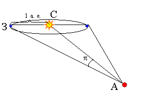 Вследствие годичного движения Земли по орбите близкие звезды немного перемещаются относительно далеких «неподвижных» звезд. За год такая звезда описывает на небесной сфере малый эллипс, размеры которого тем меньше, чем звезда дальше. В угловой мере большая полуось этого эллипса приблизительно равна величине максимального угла, под каким со звезды видна 1 а. е. (большая полуось земной орбиты), перпендикулярная направлению на звезду. Этот угол (p), называемый годичным или тригонометрическим параллаксом звезды, равный половине ее видимого смещения за год, служит для измерения расстояния до нее на основе тригонометрических соотношений между сторонами и углами треугольника ЗСА, в котором известен угол p и базис – большая полуось земной орбиты (см. рис. 1).