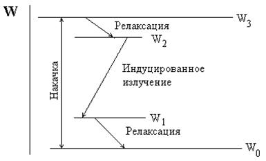 Материалы, предназначенные для изготовления лазеров, должны иметь вполне определенный набор энергетических уровней. Наиболее удобно использовать четырехуровневую квантовую систему. Индуцированное излучение происходит при переходах в активных атомах с уровня W2 на уровень W1. Накачка системы энергией обеспечивает переход W0®W3. Время жизни электрона на энергетическом уровне W3 должно быть малым, а время жизни на уровне W2 достаточно большим. Энергетический уровень W1 должен быть, по возможности, минимальным.