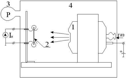 Схема используемой установки для напыления пленок показана на рис.3. В рабочий откачиваемый объем помещен источник ионов (1), формирующий поток ионизированного газа. Перед соплом источника крепится подложка (2) - пластина монокристалла кремния, нагреваемая пропусканием постоянного тока.
