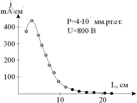 | Рис.4 Зависимость плотности плотности тока пучка ионов от расстояния до источника. |