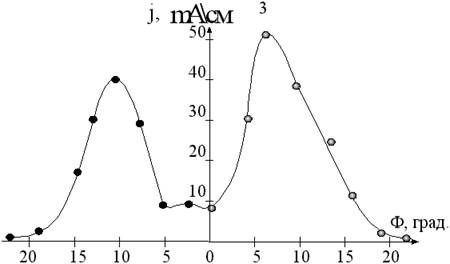 Рис.5 Зависимость плотности тока пучка ионов от угла. |