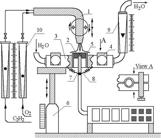 Установка позволяет провести исследования при известных [6-14] условиях синтеза: температура подложки - от 300 до 1500 К; расход газов: 1 - 4 л /мин и их отношение: R = О2 /C2H2 - до 2.5; расстояние между ядром пламени и подложкой - более 0.5мм. На рис.1 изображены: горелка - 1 (диаметр сопла: 1мм) над поверхностью подложки - 2, помещенной в теплообменник - 3 с зажимами - 4; теплоизолятор - 5 между подложкой и теплообменником, укреплённым на координатнике - 6; термопара - 7 вставлена в тело подложки и поджата пружинами - 8; измерители расхода воды - 9 и газов -10. В качестве материала подложки использовали молибденовые цилиндры (высота 5 и диаметр 10 мм). Спай термопары прижимался к подложке с помощью пружин. Проведенное исследование с помощью теплового датчика показало, что температура поверхности выше температуры подложки в точке измерения не более чем на 17 К при Тп = 900 К, а ошибка в измерении температуры, связанная со способом крепления термопары в молибденовой подложке, не превышает 60К при температуре 900К и определялась по точкам плавления химически чистого олова и меди в качестве реперов в специальном эксперименте.