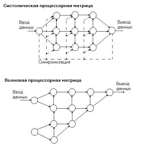 Рис. иллюстрирует различие между систолическими и волновыми матрицами процессорных элементов. Для реализации и систолических, и волновых мультипроцессоров, в которых каждый элемент представляет собой 32-разрядный микропроцессор, могут быть применены транспьютеры Т414. Возможен и другой подход, при котором матрица строится из одноразрядных микропроцессоров, причем множество таких элементарных процессоров размещается конструктивно в одной интегральной схеме.
