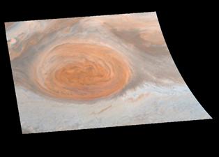 Рис. 6. Истинное цветное изображение Большого Красного Пятна принимаемого орбитальным аппаратом «Галилео». Большое Красное Пятно - гигантская штормовая система, которая, как известно, существует в течение более чем 300 лет. Оно вращается, поскольку на планете существует огромный антициклон. Оно имеет размер около 24,000 км вдоль и 11,000 км поперек. | |