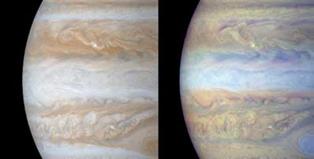 Рис. 7. Облачный покров Юпитера Представленные слева две фотографии одной и той же области Юпитера показывают его облачный покров в естественных (слева) и искусственно скомбинированных (справа) цветах, чтобы была видна разница в высоте облаков. Бури, происходящие высоко в атмосфере планеты, видны на фотографиях в виде белых точек. Изображения были получены фотокамерой Cassini через разные фильтры 31 декабря 2000 года. Размер самых маленьких деталей, видимых на снимках, составляет 60 километров в поперечнике. |