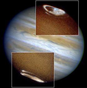 Рис. 11. Полярные сияния на Юпитере Космический телескоп Хаббл показывает принятое им ультрафиолетовое излучение. На снимке видно полярное сияние в обоих Юпитерских полюсах. Эти изображения с высоким разрешением показывают вызванное полярным сиянием свет, растягивающийся на нескольких сотен километров вдоль Юпитера. Изображения Геомагнитного полярного сияния, принимаемого различными экипажами космического корабля Шаттл, показывают подобные снимки. Полярные сияния вызываются электрически заряженными частицами, пойманными в спирали магнитных полей у полюсов планеты. Поскольку они достигают верхних слоев атмосферы они возбуждают атомы и молекулы, заставляющие их светиться. Вызванное полярное сияние на Юпитере возникло из-за очень сильного магнитного поля Юпитера. |