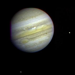 Рис. 12. Юпитер и его Спутники Юпитер и три из четырех его самых больших спутников, засняты с расстояния в 28.4 миллионов километров орбитальной станцией «Вояджер-1» в 1979 году. Самый ближний к Юпитеру спутник Ио может быть замечен напротив диска Юпитера. Справа – спутник Европа, снизу - Каллисто. Все три спутника облетают по орбите Юпитер в экваториальной плоскости и всегда повернуты одной и тоже стороной к Юпитеру. Заметно также известное Большое Красное Пятно |