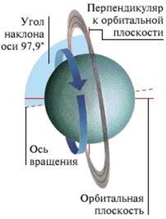 Вращение Урана обладает рядом отличительных особенностей: ось вращения почти перпендикулярна (98°) к плоскости орбиты, а направление вращения противоположно направлению обращения вокруг Солнца, то есть обратное (из всех других больших планет обратное направление вращения наблюдается только у Венеры).