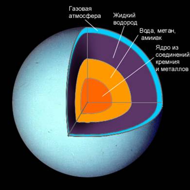 Теоретическая модель строения Урана такова: его поверхностный слой представляет собой газожидкую оболочку, под которой находится ледяная (смесь водяного и аммиачного льда) мантия, а еще глубже - ядро из твердых пород. Масса мантии и ядра составляет примерно 85-90% от всей массы Урана. Зона твердого вещества простирается до 3/4 радиуса планеты.