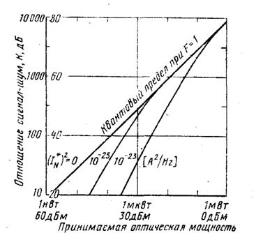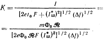 На рис. 4 изображена зависимость К. от Фо для случая т = 0,5, R= 0,5 А/Вт, F ==- 1 и <¦ = 5 МГц, а величина (I*ш)2 играет роль параметра. Из рис.4 следует, что шум малошумящих систем даже в случае применения p-i-n - фотодиодов ограничен предельным уровнем квантового шума.