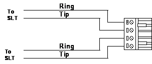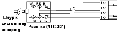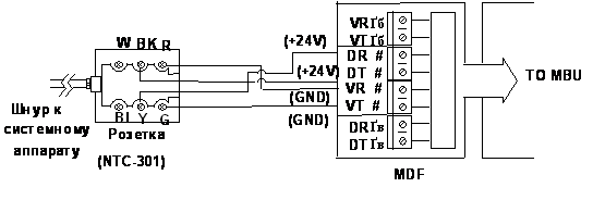 Плата ETIB содержит 4 порта интерфейса аналоговых системных аппаратов. Следует соблюдать осторожность, если подсоединение системных аппаратов производится при включенном питании мини-АТС. Для подключения системных аппаратов используется 4-проводный кабель (две витые пары). Первая пара проводов (VT, VR) обеспечивает прохождение речевого сигнала. Вторая пара проводов (DT, DR) предназначена для передачи цифровой сигнальной информации. Питание системного аппарата осуществляется по “фантомной” схеме, при этом по второй паре (DT, DR) подается напряжение питания + 24 В, а по первой паре (VT, VR) - “земля” (GND).