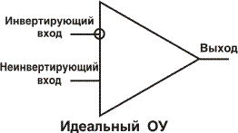 В идеале ОУ должен иметь бесконечные КУ и входное сопротивление и не входить в насыщение. Современные ОУ близки по первым двум характеристикам к идеалу, но режима насыщения, к сожалению, избежать невозможно, не нарушая законов ©Кирхгофа. Реальный ОУ в настоящее время имеют входное сопротивление от 1 МОм до 1 ГОм, КУ - 10000 .100000, и можно сказать, что эти величины стремятся к бесконечности, а их характеристики близки к идеальным. В этой главе мы представим реальный ОУ как идеальный, так как нас пока не интересуют ни частотные, ни температурные характеристики. Для начала примем несколько утверждений: