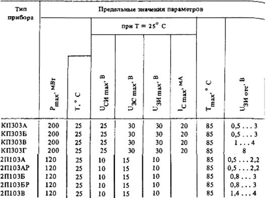 На вход полевого транзистора подается исходный сигнал (в рассматриваемом случае синусоидальный), а на затвор - управляющий сигнал (последовательность прямоугольных импульсов). В зависимости от значения напряжения на затворе полевого транзистора, он находится либо в открытом, либо в закрытом состоянии, пропуская или не пропуская сигнал со входа. Далее видоизмененный сигнал поступает на инвертирующий вход операционного усилителя, где меняет фазу на π и усиливается. При сборке схемы мной были использованы полевые транзисторы КП303 и КП103, параметры которых приведены в таблице.