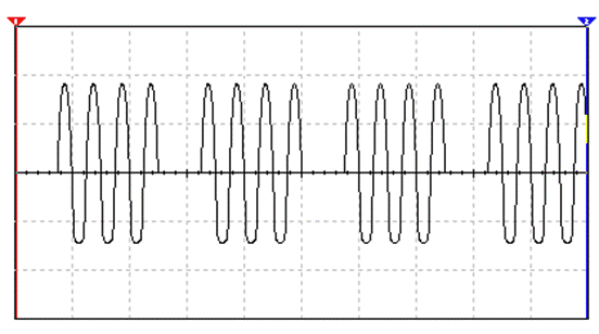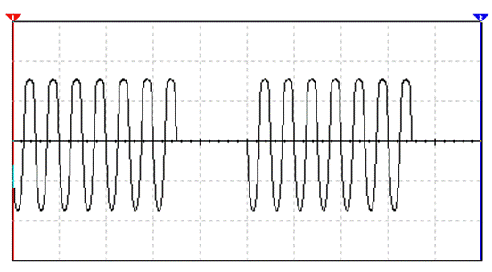 на выходе получаем радиоимпульс, причем длительностью радиоимпульса можно управлять, изменяя длительность и частоту повторения управляющего сигнала. В данном примере отношение времени наличия сигнала на выходе к времени его отсутствия составляет 50%.