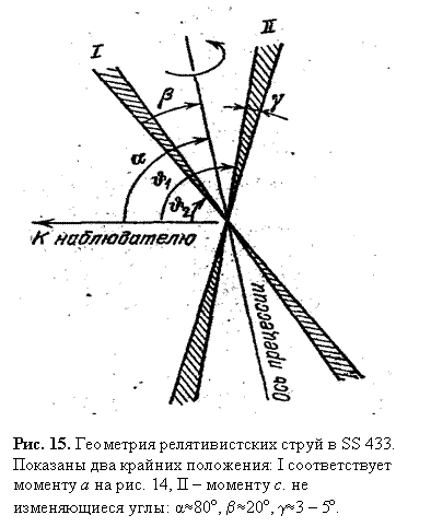 Эта модель способна полностью воспроизвести кривые красного смещения на рис. 14. Нужно только должным образом подобрать скорости струй, ориентацию оси прецессии относительно земного наблюдателя и угол, который струи составляют с осью прецессии (рис.15)