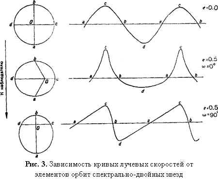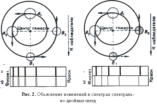 Характер и причина изменения спектров спектрально-двойных звезд объясняются рис. 2. Если очень близкие компоненты двойной звезды, движущиеся вокруг общего центра масс, мало отличаются друг от друга по спектру и по бле