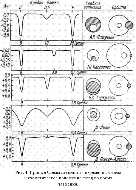 По характеру кривой блеска затменной переменной звезды можно найти элементы орбиты одной звезды относительно другой, относительные размеры компонентов, а в некоторых случаях даже получить представление об их форме. На рис. 4 показаны кривые блеска некоторых затменных переменных звезд вместе с полученными на их основании схемами движения компонентов. На всех кривых заметны два минимума: глубокий (главный, соответствующий затмению главной звезды спутником), и слабый (вторичный), возникающий, когда главная звезда затмевает спутник.
