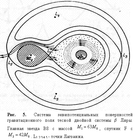 1. Характер затмений (частное, полное или центральное) определяется наклонением i и размерами звезд. Когда i = 90°, затмение центральное, как у b Лиры (рис. 5). В тех случаях, когда диск одной звезды полностью перекрывается диском другой, соответствующие области кривой блеска имеют характерные плоские участки (как у IH Кассиопеи), что говорит о постоянстве общего потока излучения системы в течение некоторого времени, пока меньшая звезда проходит перед или за диском большей. В случае только частных затмений минимумы острые (как у RX