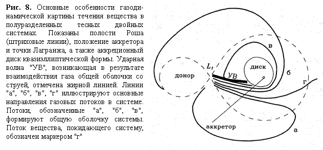 Рассмотрим двойную систему звезд. По какой орбите движется материальная точка, оказавшаяся в окрестностях этой системы? Пока она близка к одному из компонентов, ее движение определяется тяготением этого компонента. Частицы движутся по коническим сечениям (эллипс, парабола, гипербола). По мере удаления от одной звезды и приближения к другой потенциал, создаваемый одной звездой, уменьшается, а другой - растет. И где-то на линии, соединяющей звезды, существует точка, где силы притяжения двух звезд и центробежная сила уравновешены. Частица, попавшая в эту точку, может свободно перейти из поля действия одной звезды в поле действия другой. Это и есть внутренняя точка Лагранжа L1. Участки пространства вокруг каждой звезды, заключенные внутри эквипотенциальной поверхности с потенциалом, равным потенциалу в точке Лагранжа, называются полостью Роша данной звезды. Процесс массообмена может быть весьма интенсивным, если одна звезда (донор) находится в процессе перехода в красный гигант и заполняет свою полость Роша.