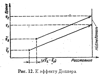 Рассмотрим сначала случай приближающегося источника (рис. 12). Если он движется по направлению к нам со скоростью