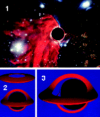 На рисунках: черная дыра засасывает газ и пыль (1). Компьютерные модели показывают, как искривляется пространство вблизи черной дыры. Для наглядности изображено кольцо (2), возле черной дыры оно изгибается, как поля шляпы. В другом случае, когда черная дыра вращается (пока считают, что некоторые из них неподвижны), кольцо становится еще и