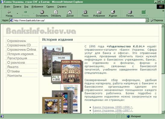 Это своеобразная электронная версия справочников-каталогов "Банки Украины. Сфера услуг для банка и офиса". Справочные издания, призванные облегчить поиск нужной информации о банковских учреждениях, банках, их отделениях и филиалах, фирмах и организациях, связанных с банковской тематикой, учебными заведениями банковской специализации.