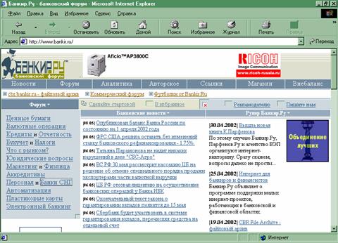 Этот сайт полностью посвящён банкирам, банковскому делу. На нём можно прочитать о ценных бумагах, валютных операциях, кредитах, бухучёте и налогах, а также найти любой банк в пределах СНГ.