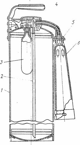 Воздушно-пенный огнетушитель ОВП-10 (рисунок 2) состоит из стального корпуса, в котором находится 4-6 % водный раствор пенообразователя ПО-1, баллончика высокого давления с углекислотой, для выталкивания заряда, крышки с запорно-пусковым устройством, сифонной трубки и раструба-насадки для получения высокократной воздушно-механической пены.