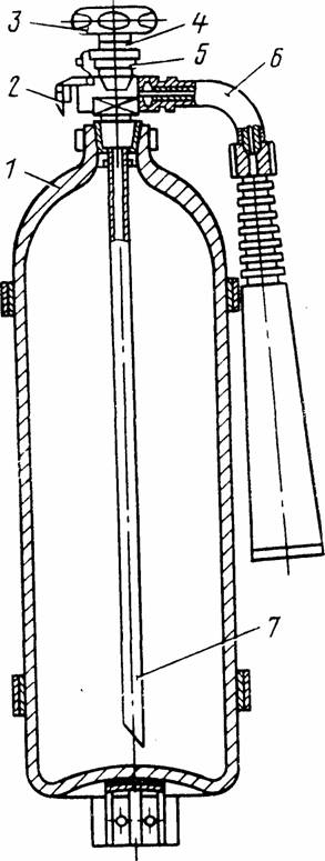 Углекислотные огнетушители выпускаются как ручные (ОУ-2, ОУ-5, ОУ-8), так и передвижные (ОУ-25, ОУ-80). Ручные огнетушители (рисунок 3) одинаковы по устройству и состоят из стального высокопрочного баллона, в горловину которого ввернуто запорно-пусковое устройство вентильного или пистолетного типа, сифонной трубки, которая служит для подачи углекислоты из баллона к запорно-пусковому устройству, и раструба-снегообразователя. В огнетушителе ОУ-8 раструб присоединяется к запорной головке через бронированный шланг длиной 0,8 м. Баллоны огнетушителей заполнены жидкой углекислотой под давлением 6-7 МПа.