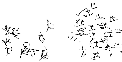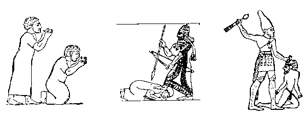 Поза подчинения у человека. На ассирийском рельефе VII в. до н.э. изображены завоеванные мирные жители Палестины (слева). Подчинение умиротворяет агрессора: царь замещает нанесение ударов ритуальным похлопыванием ногой по плечу и рукой с оружием по спине (в середине). Подергать вставшего в позу покорности противника за волосы - одна из программ снятия победителем собственной агрессивности.