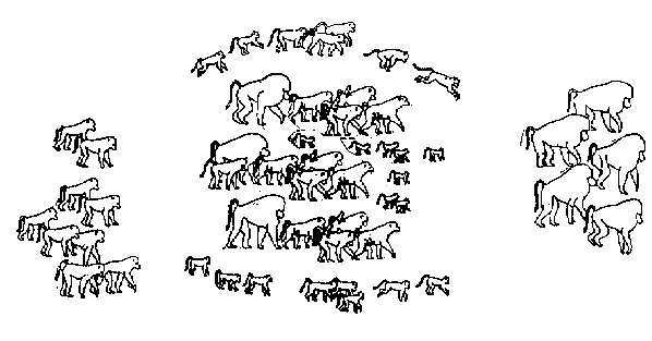 Каждый, кто знаком с армией, восклицает: "Это же предбоевой порядок пехоты!" Да, подобное построение на марше было известно с глубокой древности, так строятся боевые отряды современных "первобытных" народов. Поэтому весьма вероятно, что так строились древние первобытные люди и их двуногие предки - австралопитеки. Защита территории - священный долг каждого павиана. Если стадо павианов встречает на своей территории пришельцев - оно их атакует и изгоняет прочь.