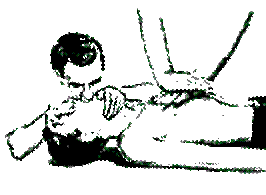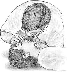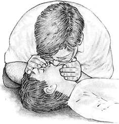 Если ребенок не дышит, приступайте к искусственному дыханию. Не меняя положения головы ребенка, большим и указательным пальцами зажмите ему нос и плотно прижмите свой рот к его рту. Сделайте 2 медленных полных вдувания воздуха, с паузой между ними. |