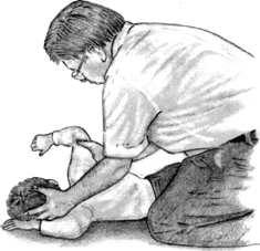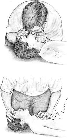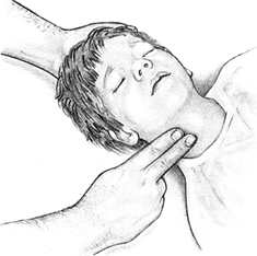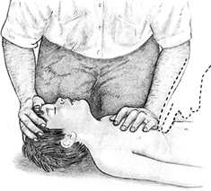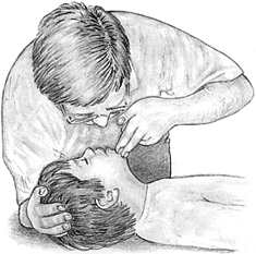 Заметив, что грудная клетка приподнимается во время искусственного дыхания, прикоснитесь двумя пальцами к адамову яблоку. Переместите пальцы в углубление между адамовым яблоком и мышцей на боковой стороне шеи. В течение 5—10 секунд пытайтесь нащупать пульс. |