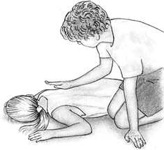 Если пульса у ребенка нет, начинайте непрямой массаж сердца. Не меняя положения головы ребенка, положите выступ своей ладони ему на грудину на 2 пальца выше ее нижнего края. Свою другую руку положите сверху. Пальцы рук сомкните замком, при этом они не должны касаться груди ребенка. Подайтесь чуть вперед и в течение 10 секунд резко нажмите на грудину 15 раз так, чтобы грудина каждый раз опускалась на 4—5 см. Нажимайте на грудину плавно и ритмично, не отрывая от нее выступа ладони. |