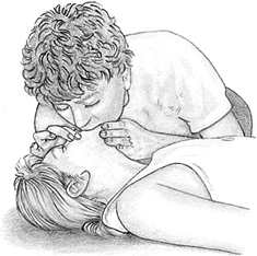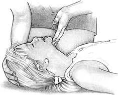 Заметив, что грудная клетка приподнимается во время искусственного дыхания, прикоснитесь двумя пальцами к адамову яблоку. Переместите пальцы в углубление между адамовым яблоком и мышцей на боковой стороне шеи. В течение 5—10 секунд пытайтесь нащупать пульс. |