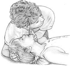 Если ребенок не дышит, приступайте к искусственному дыханию. Не меняя положения головы ребенка, большим и указательным пальцами зажмите ему нос и плотно прижмите свой рот к его рту. Сделайте 2 медленных полных вдувания воздуха, с паузой между ними. |