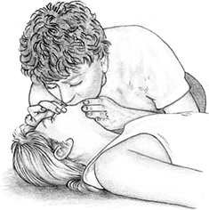 Если пульс есть, продолжайте искусственное дыхание, производя по 1 вдуванию воздуха каждые 5 секунд. Через каждые 12 вдуваний проверяйте пульс. Через 1 минуту вызовите неотложную помощь. Потом продолжайте искусственное дыхание с проверкой пульса. |