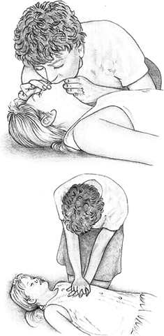 Повторяйте приемы, описанные в пунктах 10 и 11, до появления пульса или прибытия врача. Если пульс восстановился, повторяйте прием, описанный в пункте 8. | ||