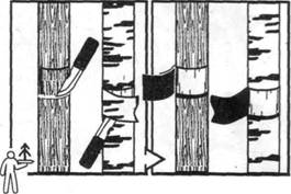 Самый простой — это сделать ножом или топором на стволе два глубоких круговых горизонтальных надреза и два соединяющих их вертикальных. Снять верхнюю кору, поддев ее с одной стороны ножом. Если она поддается плохо, можно использовать небольшие деревянные клинышки, вбиваемые между стволом и корой.