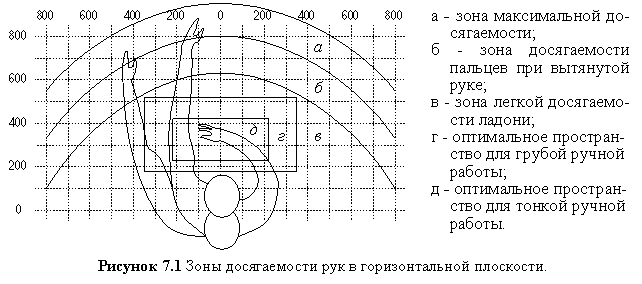 Максимальная зона досягаемости рук - это часть моторного поля рабочего места, ограниченного дугами, описываемыми максимально вытянутыми руками при движении их в плечевом суставе.