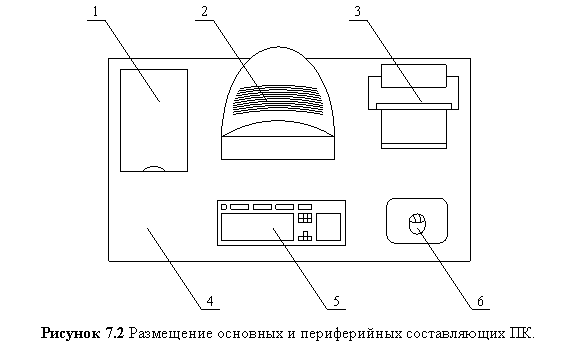 На рис. 7.2 показан пример размещения основных и периферийных составляющих ПК на рабочем столе программиста.